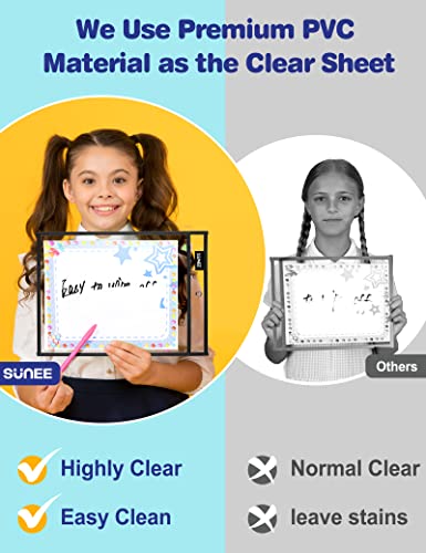 【Oversized for Easy Inserting Paper】- Our oversized write and wipe pockets make kids can easily change the letter size (8.5x11) or 9x12 worksheets by themselves.