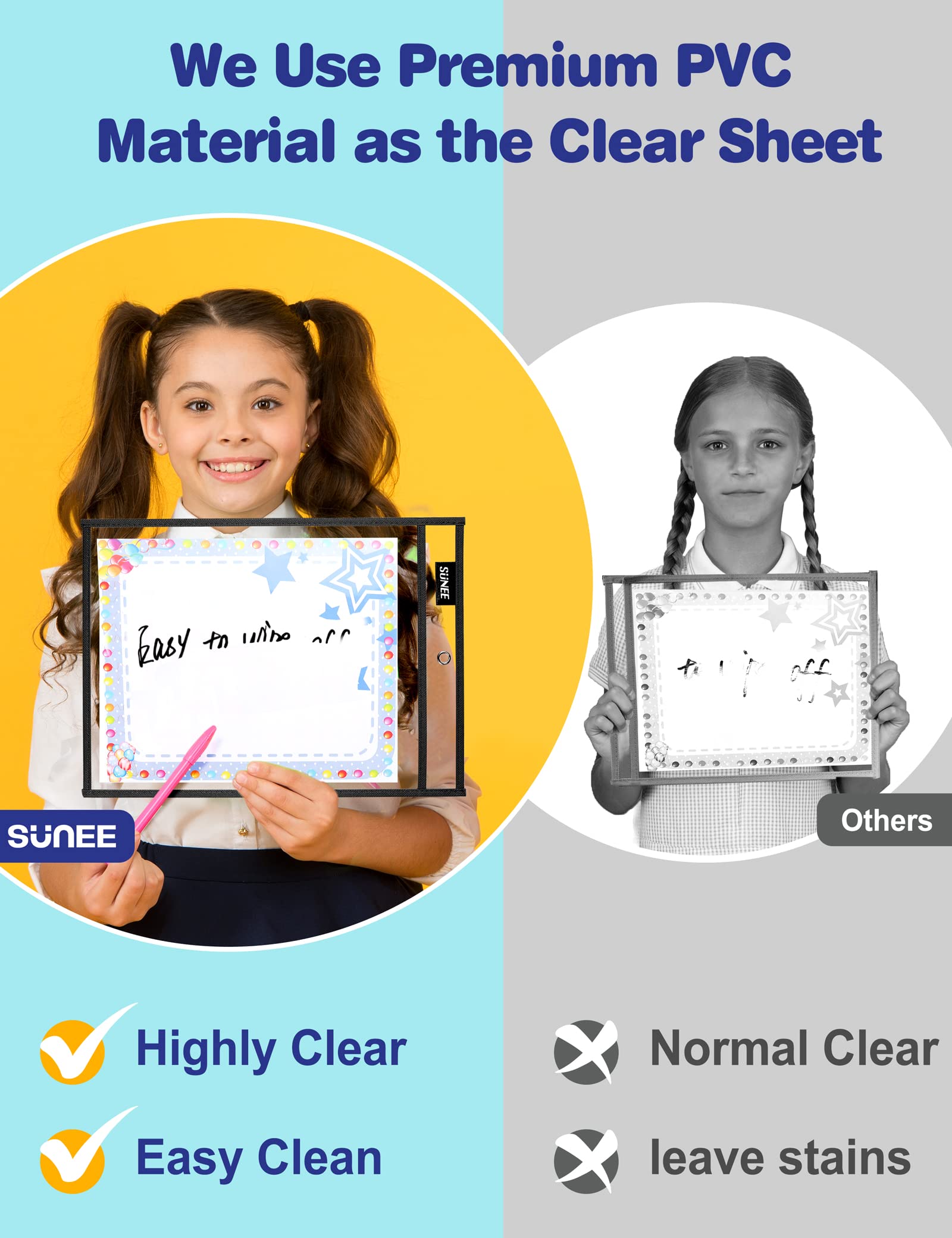【Durable for Long-Time Use】- The heavy duty cloth binding makes our reusable dry erase pocket sleeves hold up to the wear and tear of the naughty kids for full school years' use.