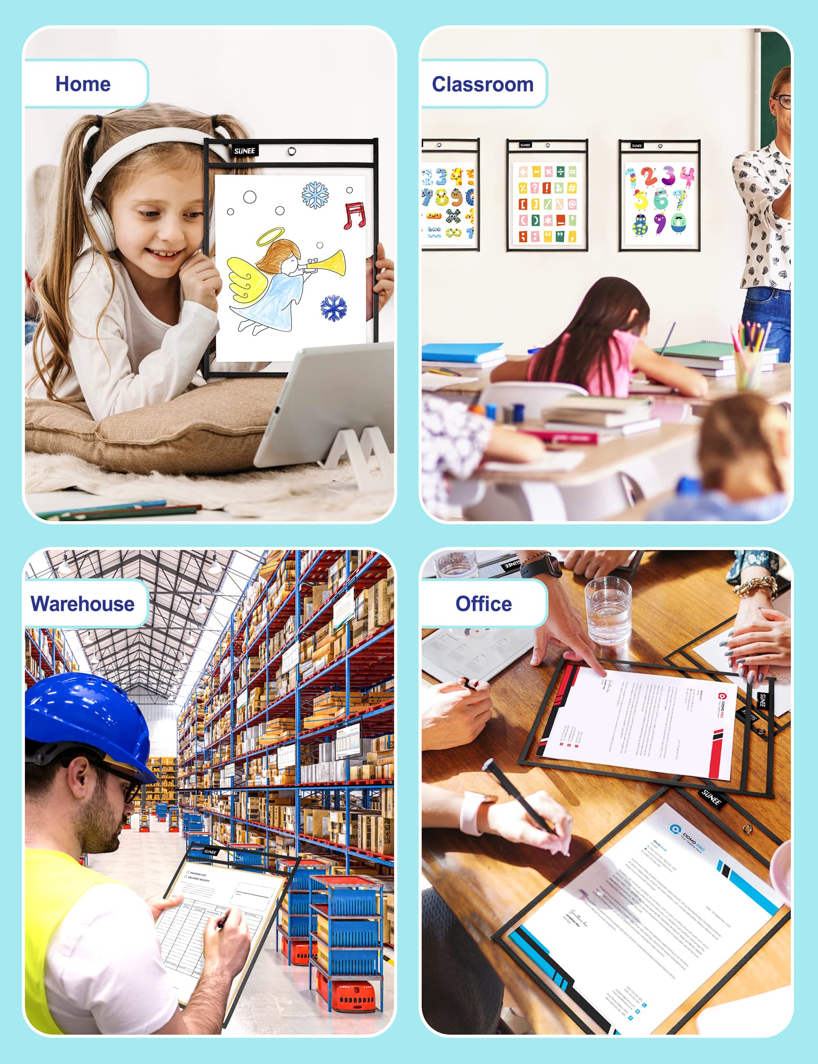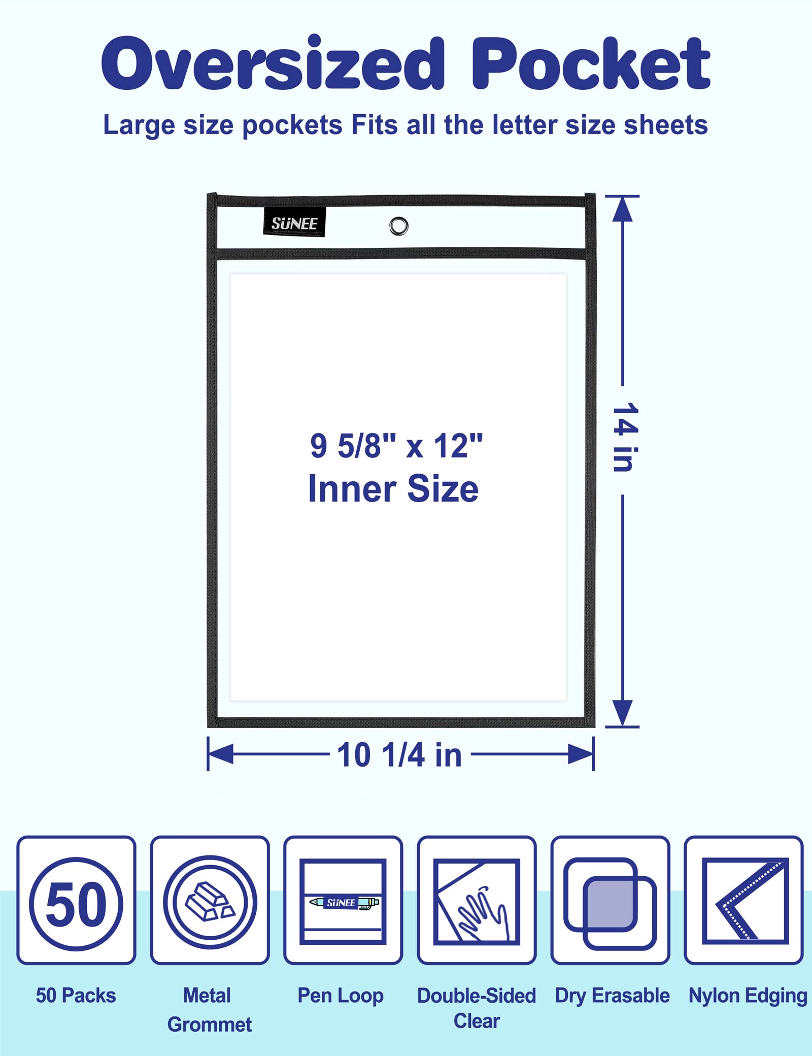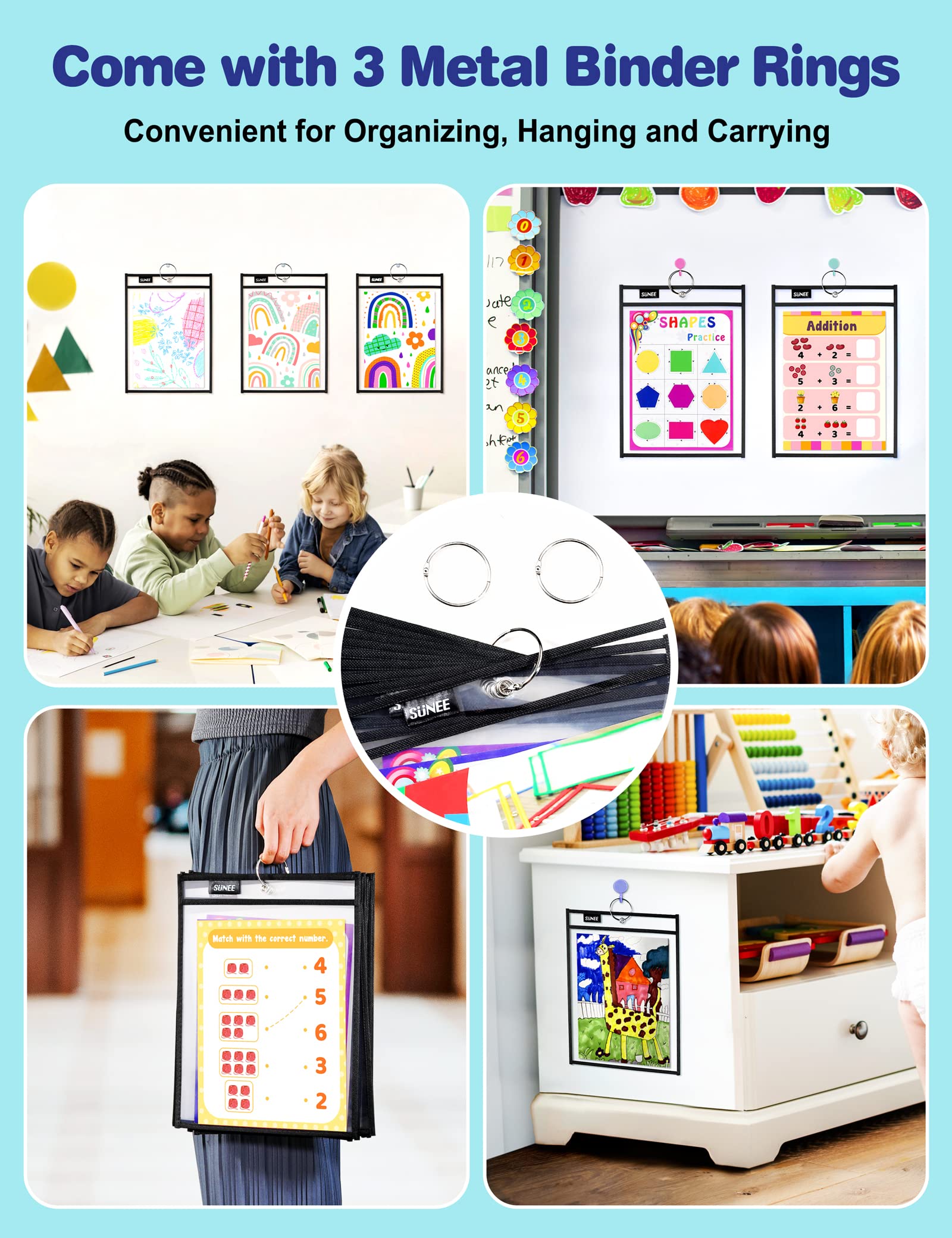 【Smart Design】- At the top of our dry erase pocket, the black tag is a pen loop, and the middle hole allows you to hang it vertically on the wall for displaying artworks, worksheets, small samples.