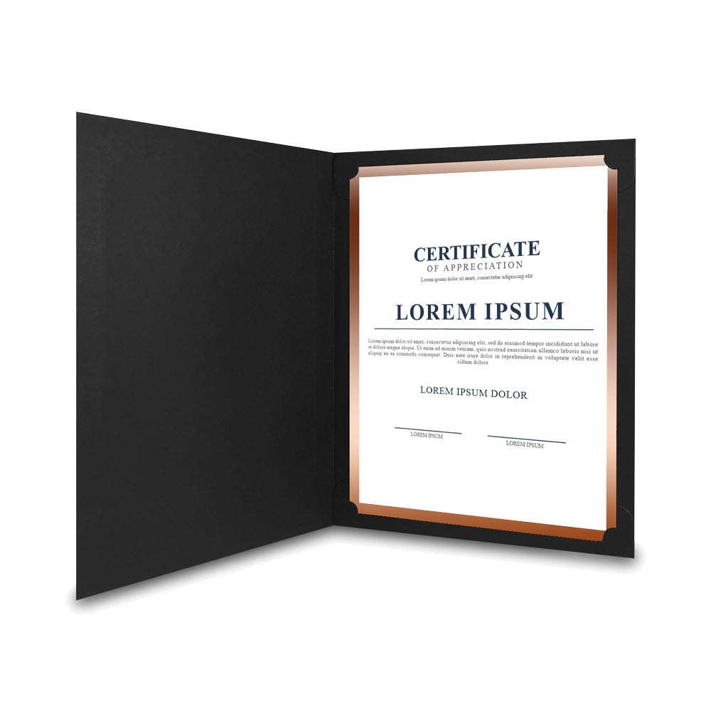 【STRUCTURE】- The foldable certificate cover holder has additional reinforcement around the edge where you insert the certificate, and semicircular cut grooves at four corners hold the paper in place.