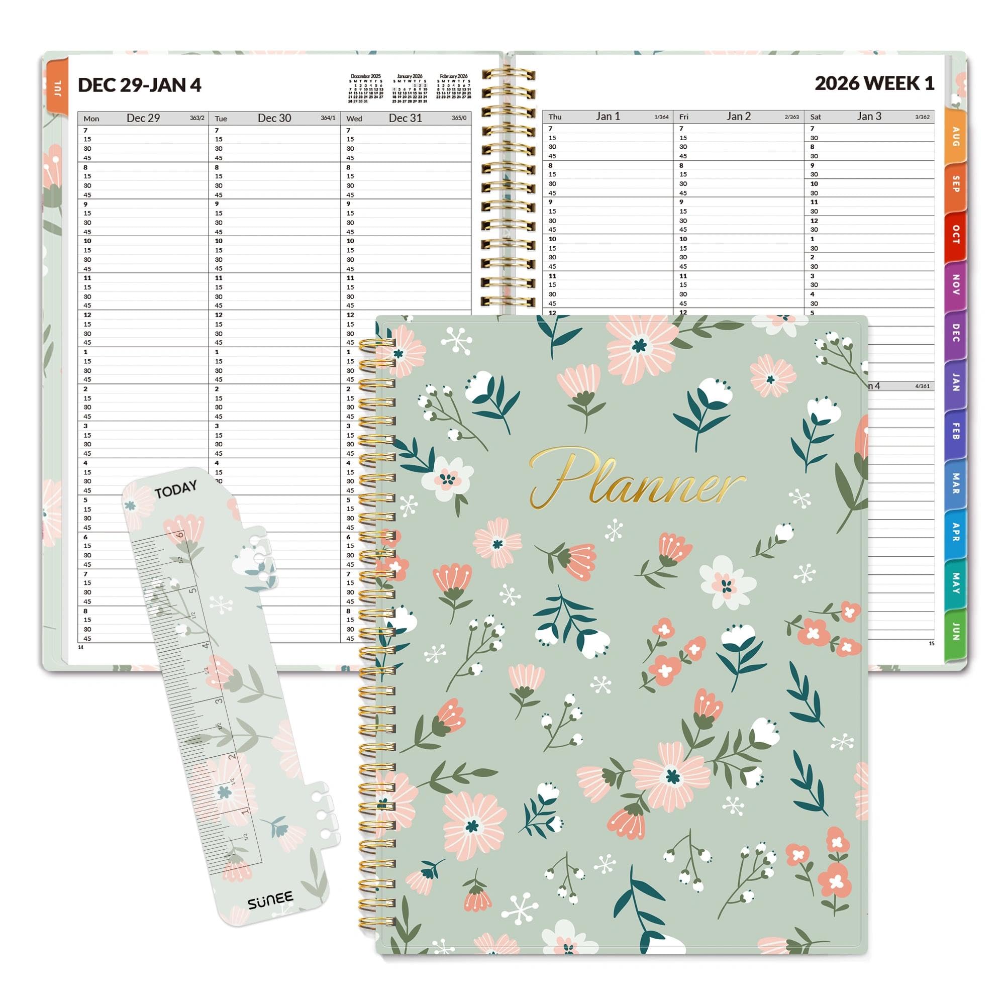 SUNEE 2026 Appointment Book, Quarter-Hourly, Weekly & Monthly - from January 2026 - December 2026, 8.5"x11" Weekly Planner, Flexible Cover, Note Pages, Pockets, Bookmark, Green Wildflowers