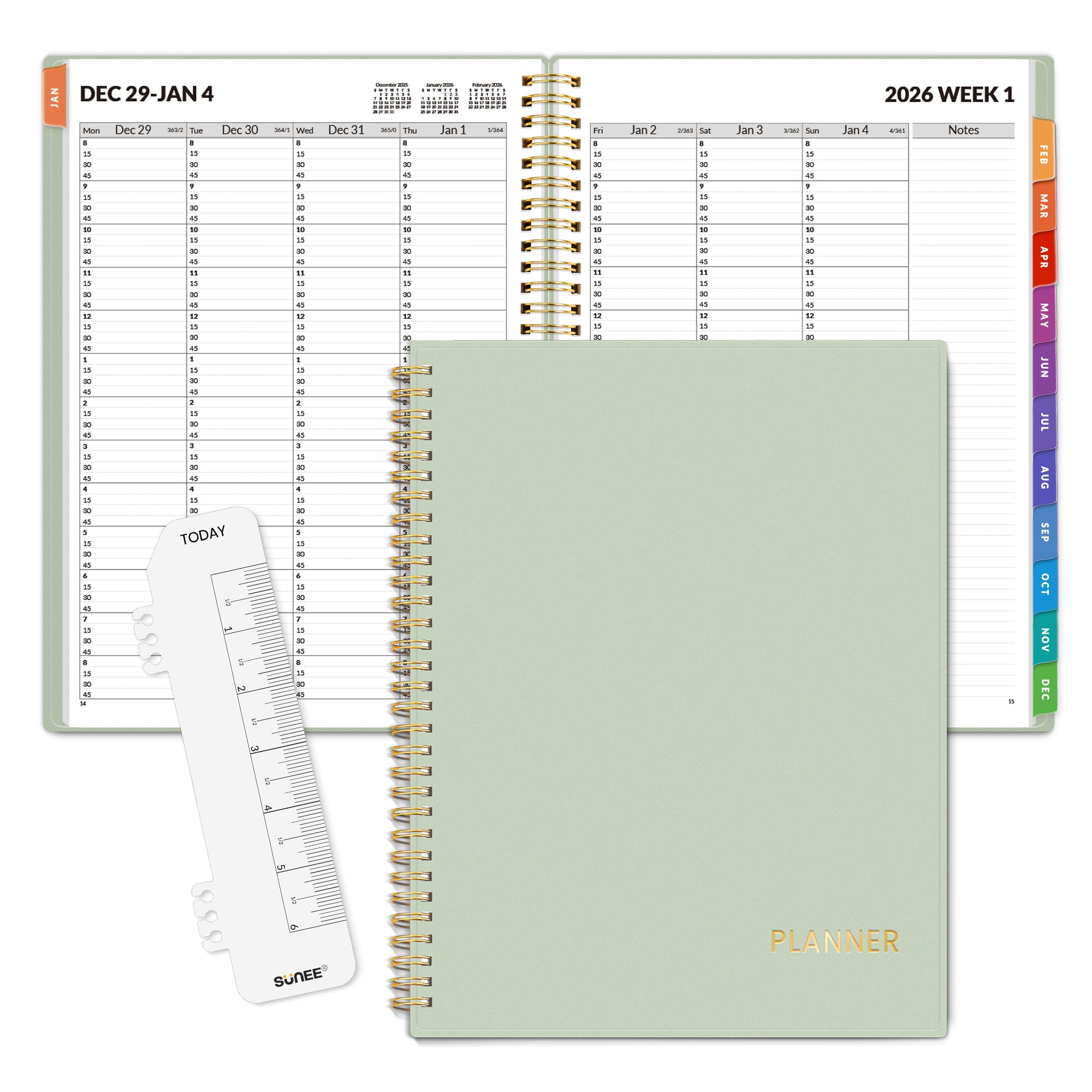 SUNEE 2026 Appointment Planner 15-Minute Time Block – Weekly & Monthly Spiral Organizer with Note Section – Thick Paper, Lay-Flat Bound – 8.5 x 11 for Office, School, Salon, Men & Women, Sage Green