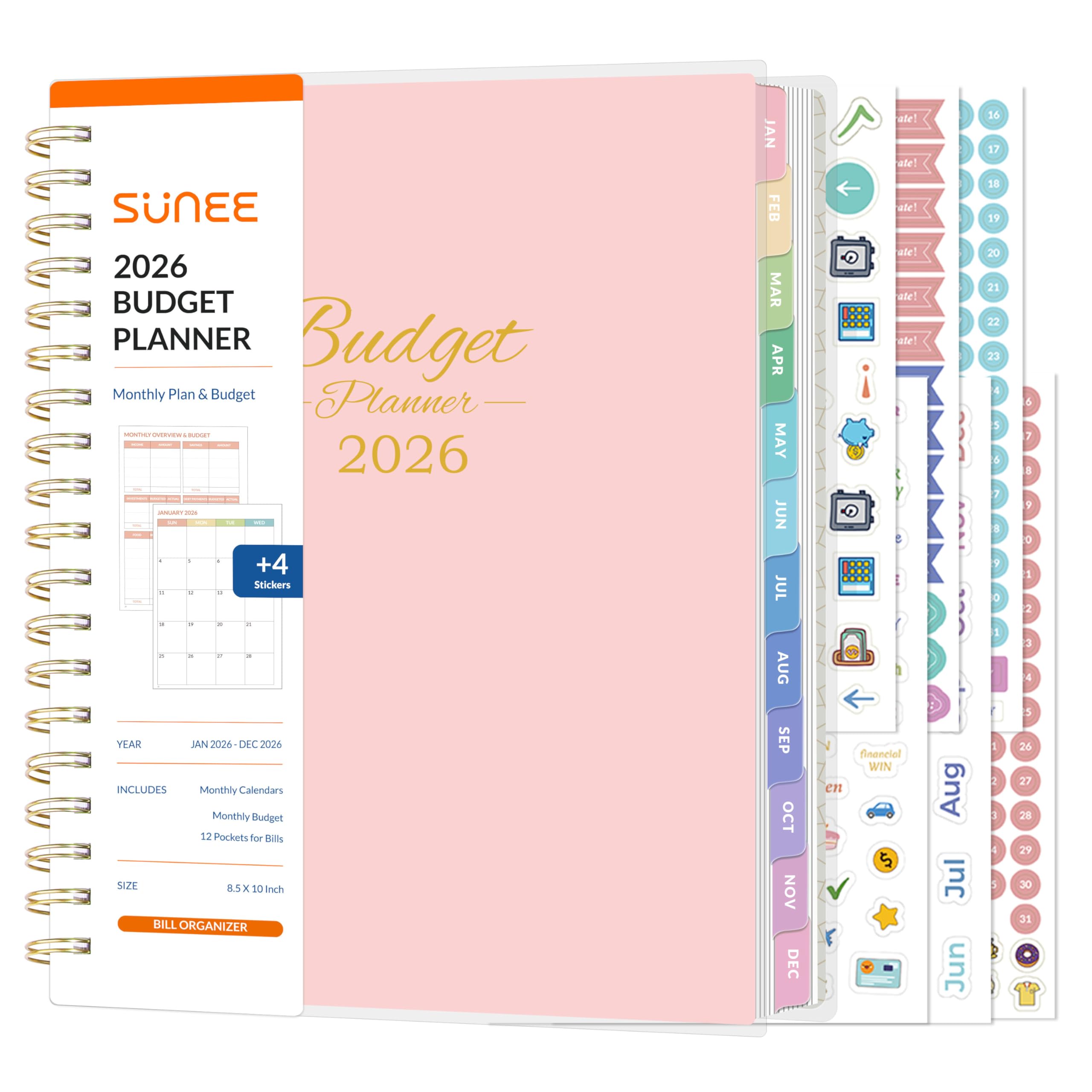SUNEE 2026 Budget Planner - Deluxe Monthly Budget Book from JAN 2026 - DEC 2026, Bill Organizer with 12-Pockets, Expense Tracker Notebook B5 Size (8" x 10"), Finance Planner Account Book, Pink