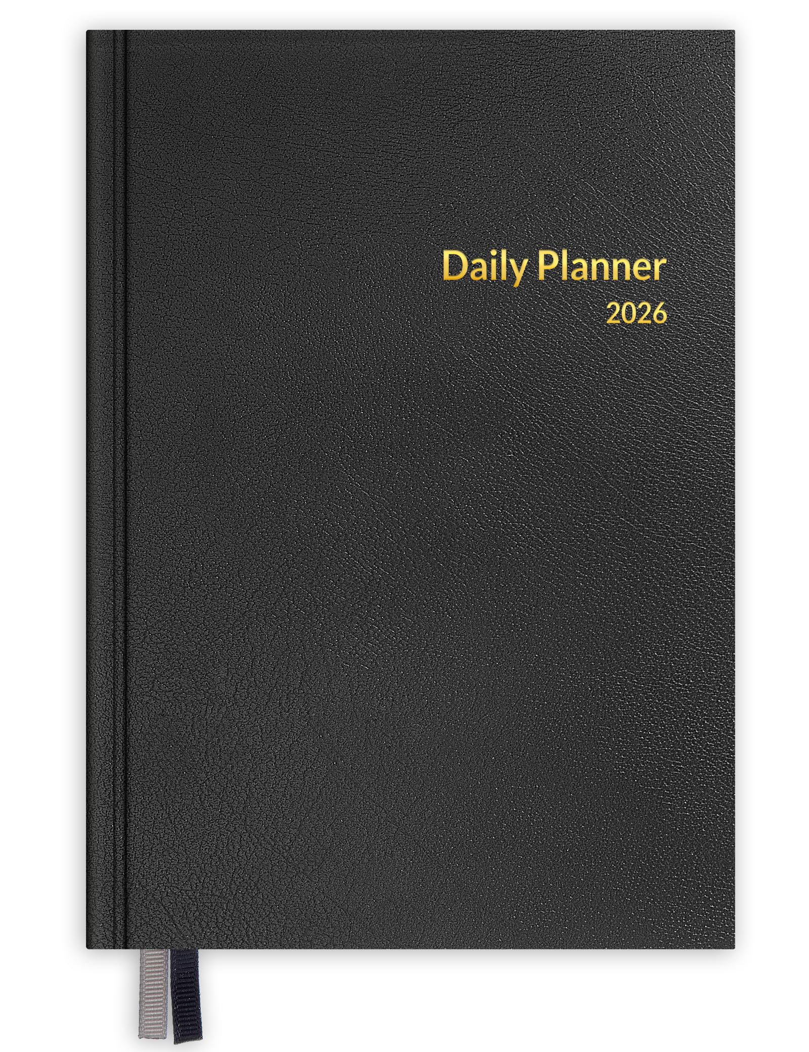 SUNEE 2026 Daily Planner A5 Hardcover – Hourly Schedule Organizer with Monthly Tabs & Task Tracker – Black Cover Time Management Notebook for Work, School, Personal Goals