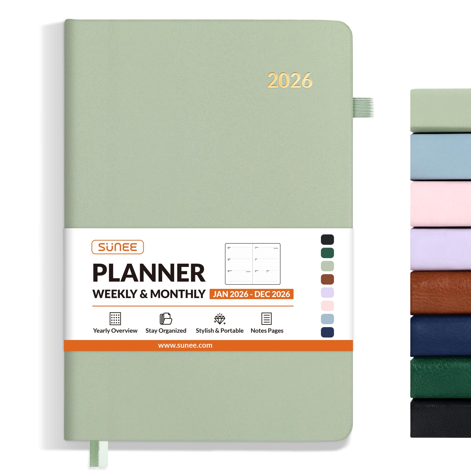 SUNEE 2026 Weekly & Monthly Hardcover Planner 5.5" x 8.3" - 12 Month (January 2026 - December 2026), Small Hardcover Planner, Pocket, Notes, 100 GSM Paper, Sage Green