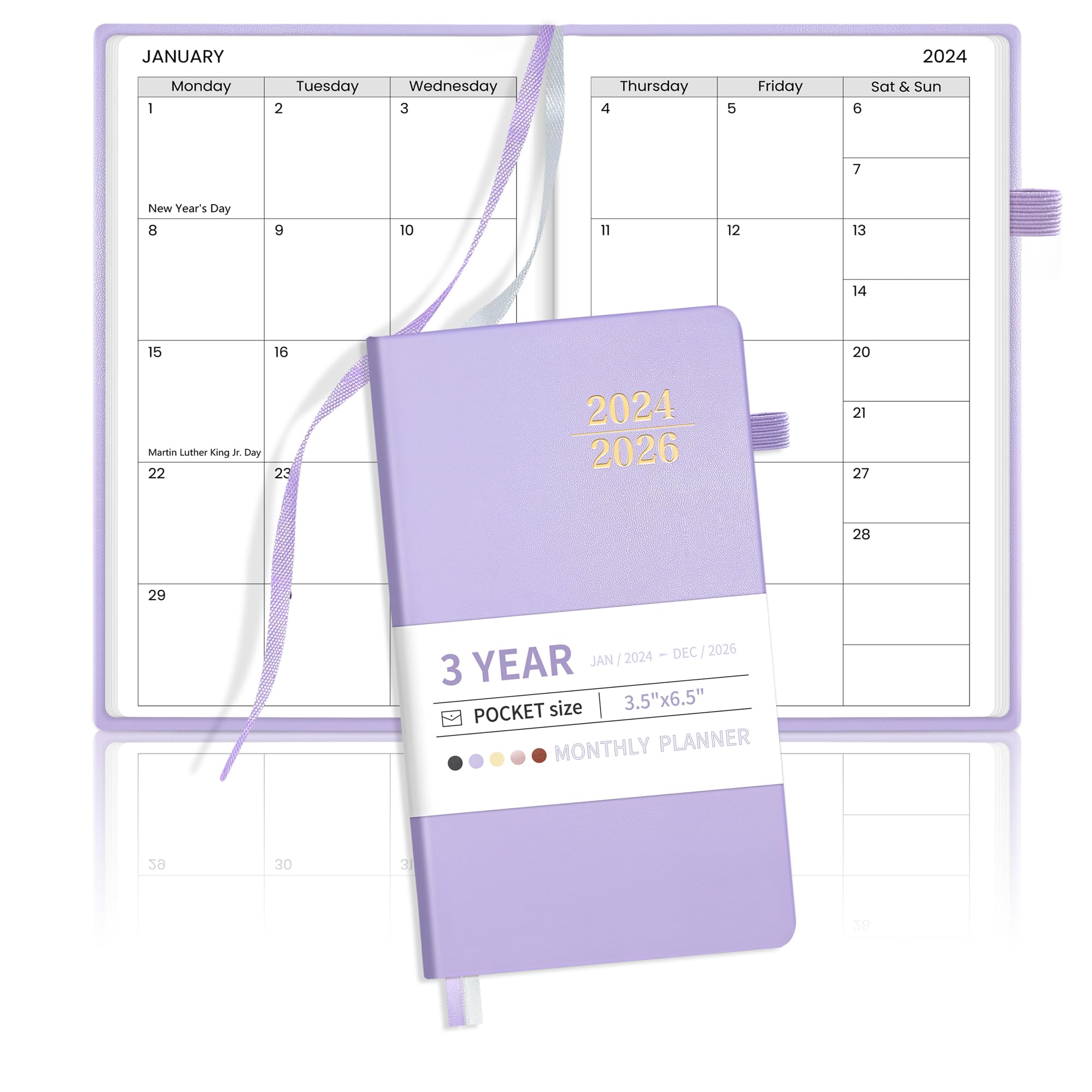 SUNEE 2024-2026 Monthly Pocket Planner - 3 Year Monthly Pocket Calendar for Purse 3.5" x 6"- 36 Month (Jan 2024 - Dec 2026) Agenda, Hardcover, Notes, Pocket, 100 GSM Paper, Monthly Sticker, Purple