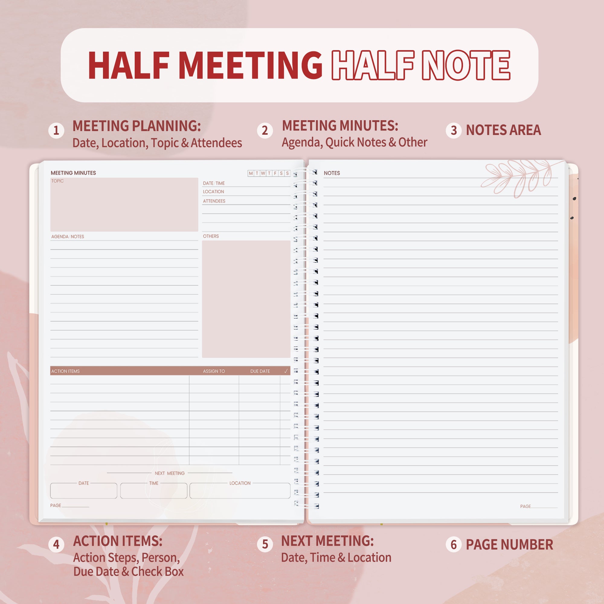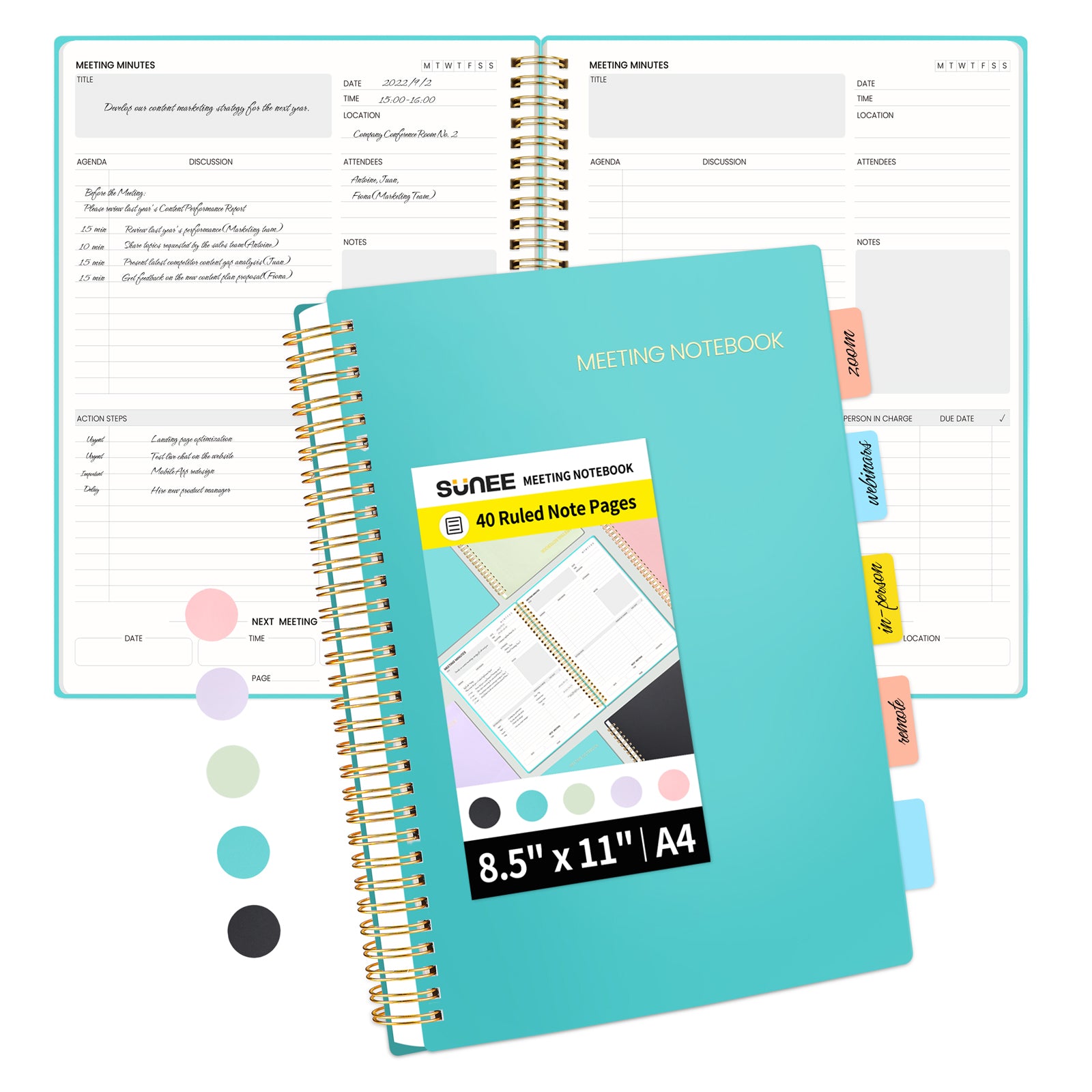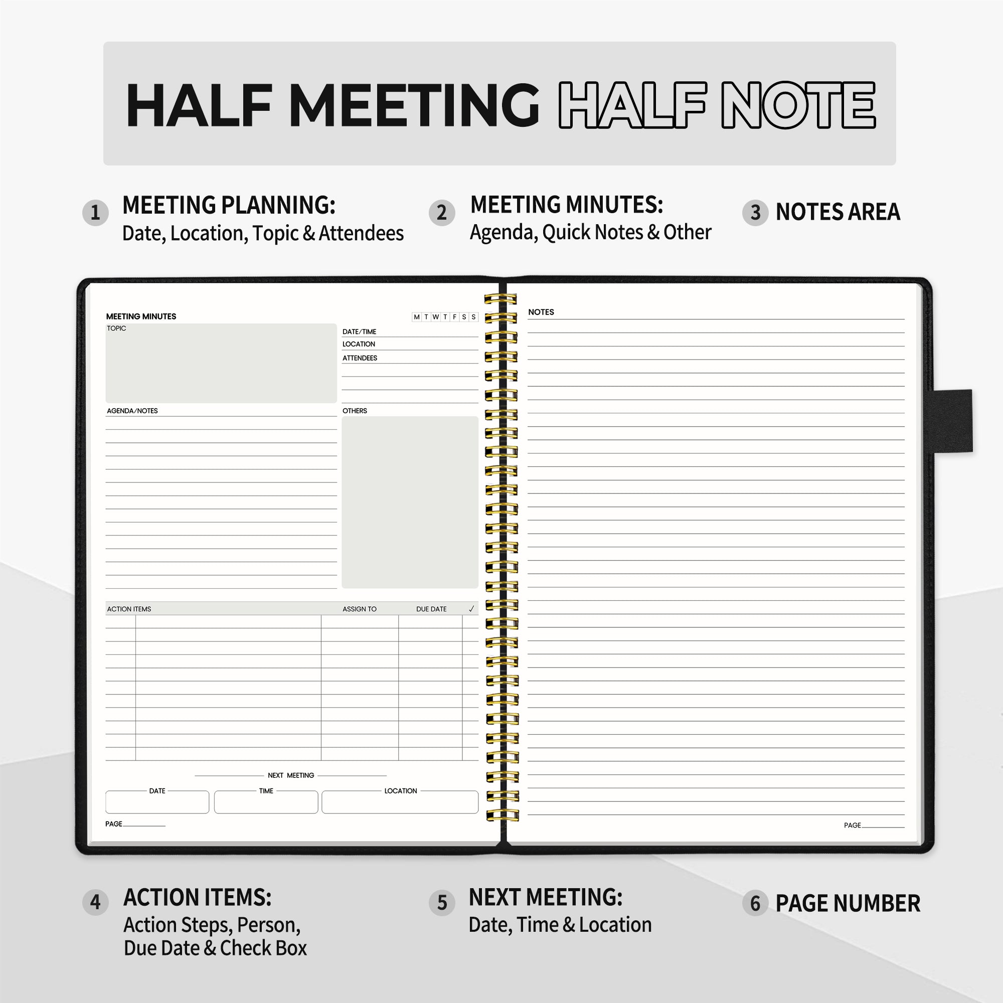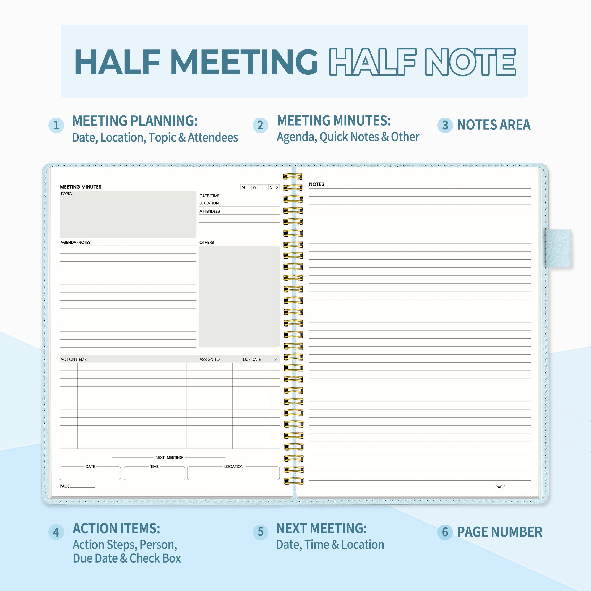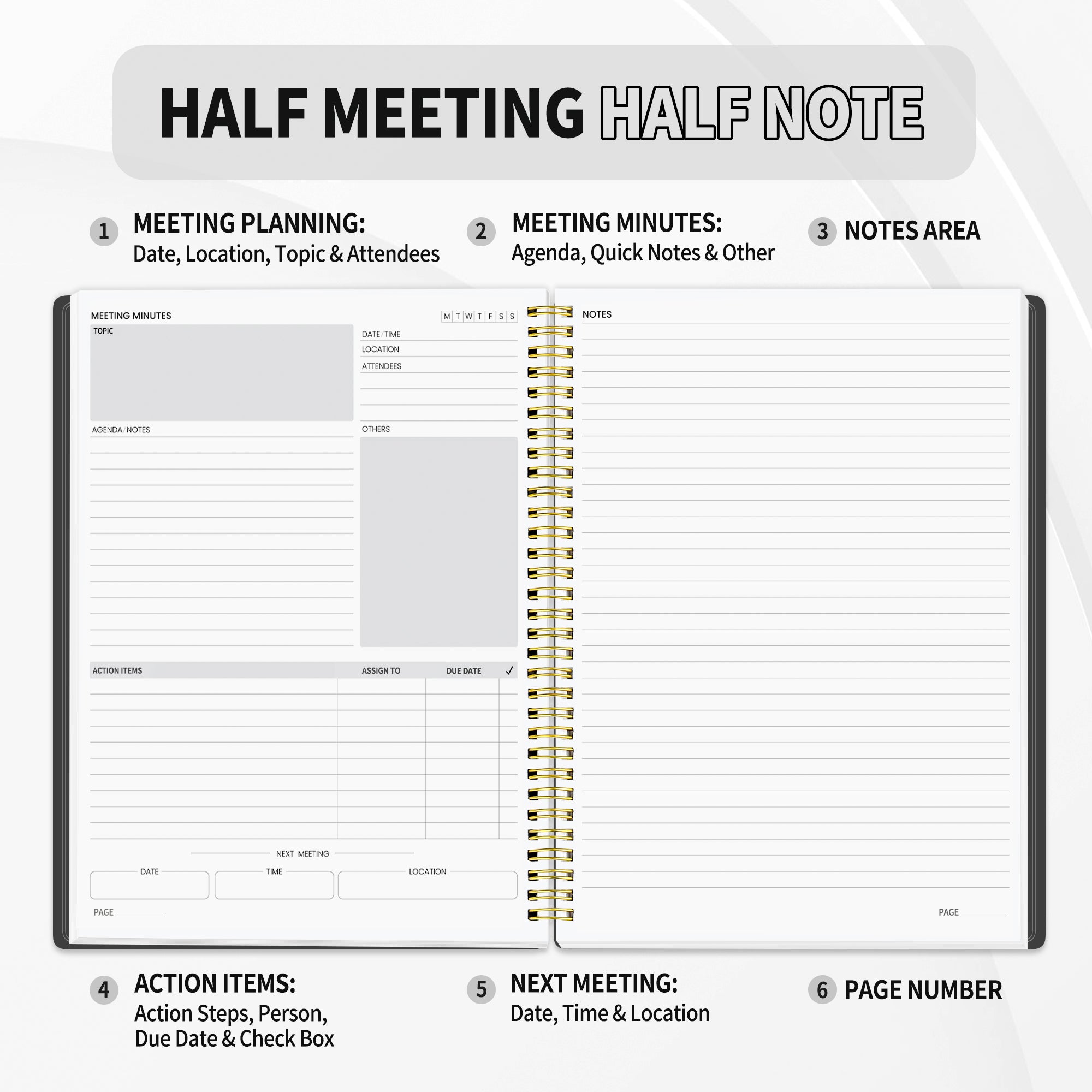 SUNEE Half Meeting Half Note - 8.5"x11" Professional Notebooks for Work - 160 Pages, A4 Size Project Planner, Spiral Meeting Agenda/Minutes Organizer for Women Men, Note Taking, Office & Business