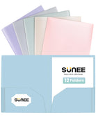SUNEE 2 Pocket Folders (12 Pack) offer durable, heavy-duty plastic construction designed to protect and organize your documents. Sized to fit standard 8.5x11 letter paper, these pastel-colored folders provide two spacious pockets for secure storage. Ideal for children, school, home, or office use, they help keep your papers neat and easily accessible while withstanding regular handling. This set combines functionality and vibrant colors for efficient document management in various environments.