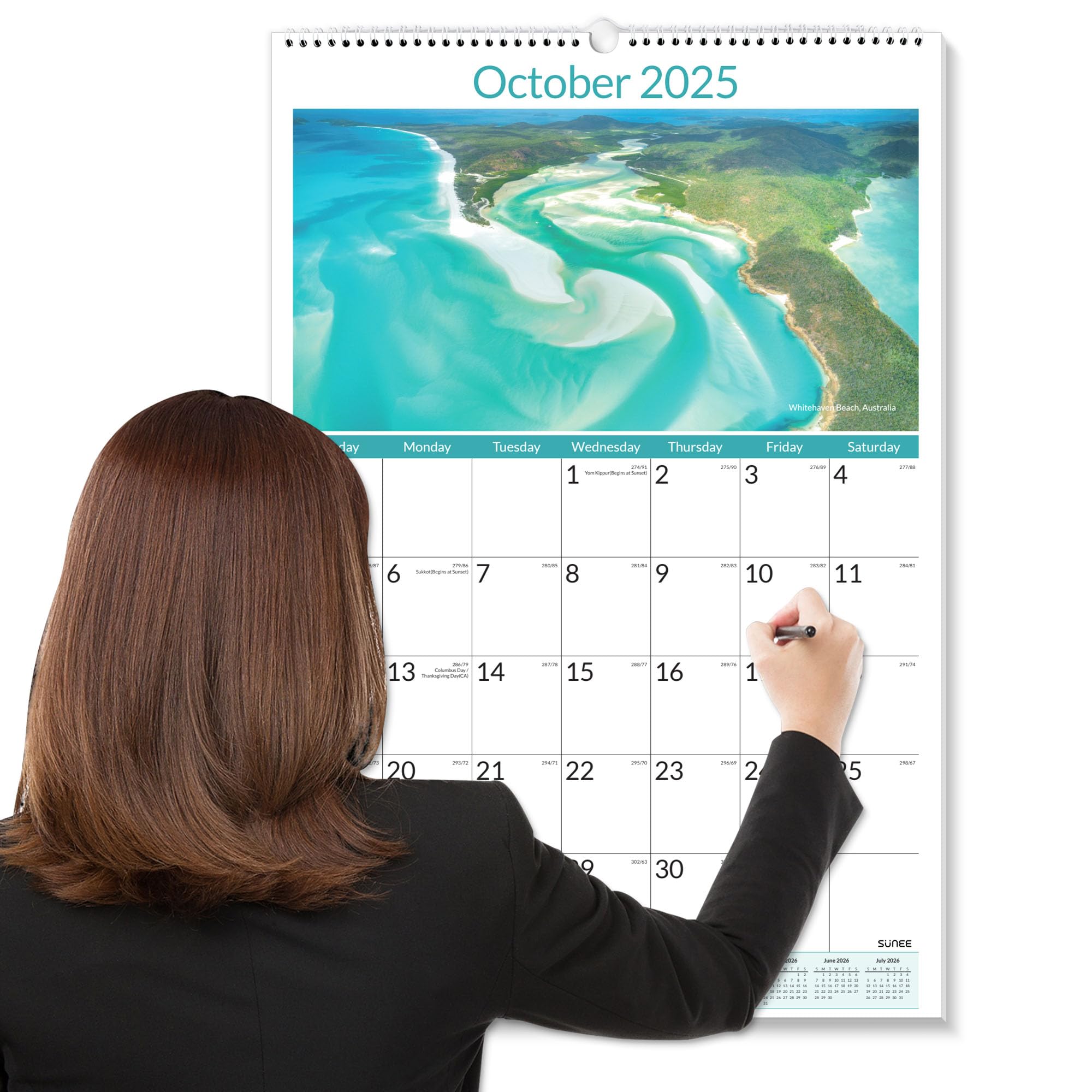 The SUNEE 2025-2026 Wall Calendar offers a spacious 22.75"x15.5" layout, featuring 21 months from October 2025 to June 2027. Designed with a vertical format, this extra-large calendar provides ample space for detailed monthly planning. Its beach-themed imagery adds a serene and inspiring touch to your workspace or home. Ideal for those seeking long-term scheduling with clarity and style, it combines functionality and aesthetic appeal for effective organization throughout 2026 and beyond.