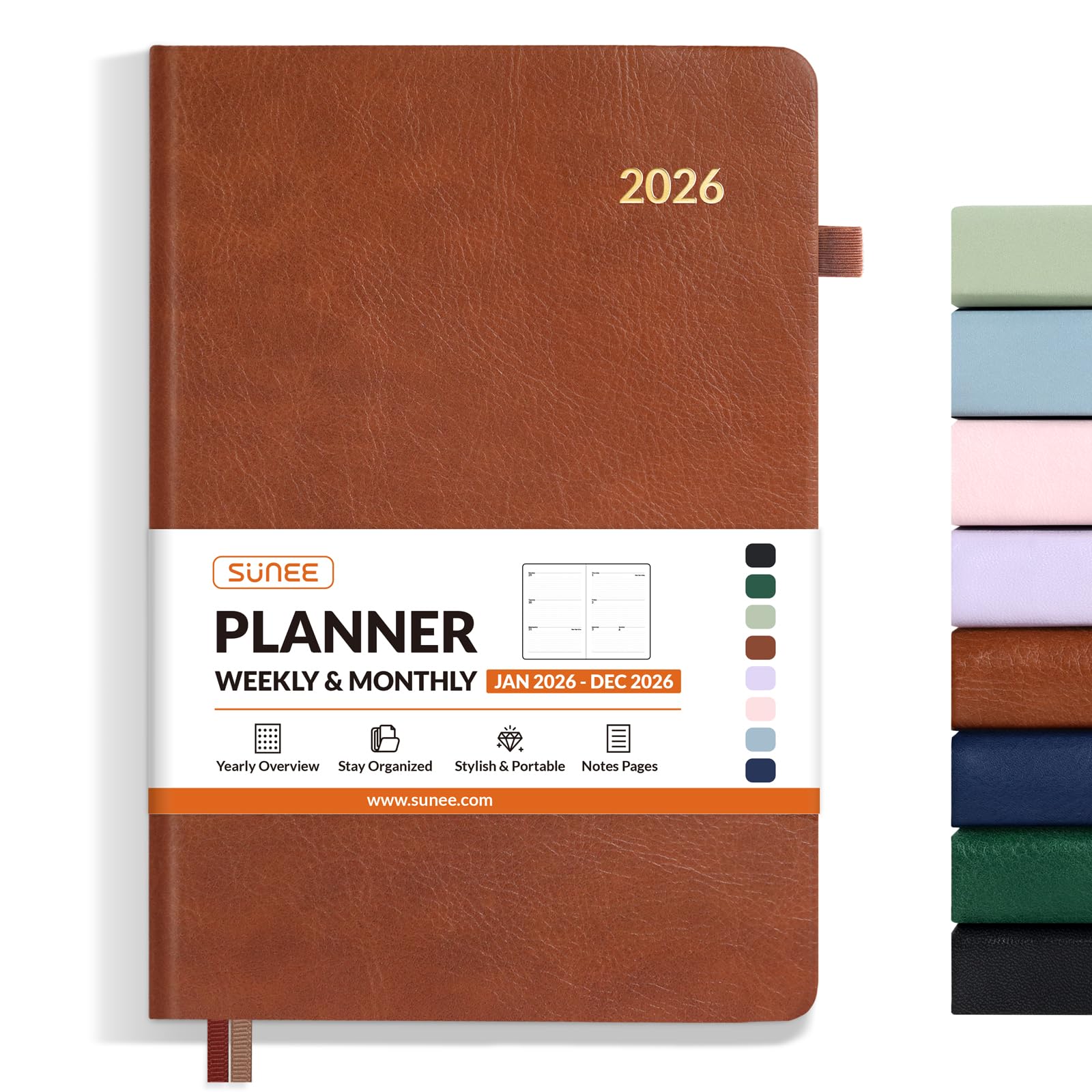 SUNEE 2026 Weekly & Monthly Hardcover Planner 5.5" x 8.3" - 12 Month (January 2026 - December 2026), Small Hardcover Planner, Pocket, Notes, 100 GSM Paper, Brown