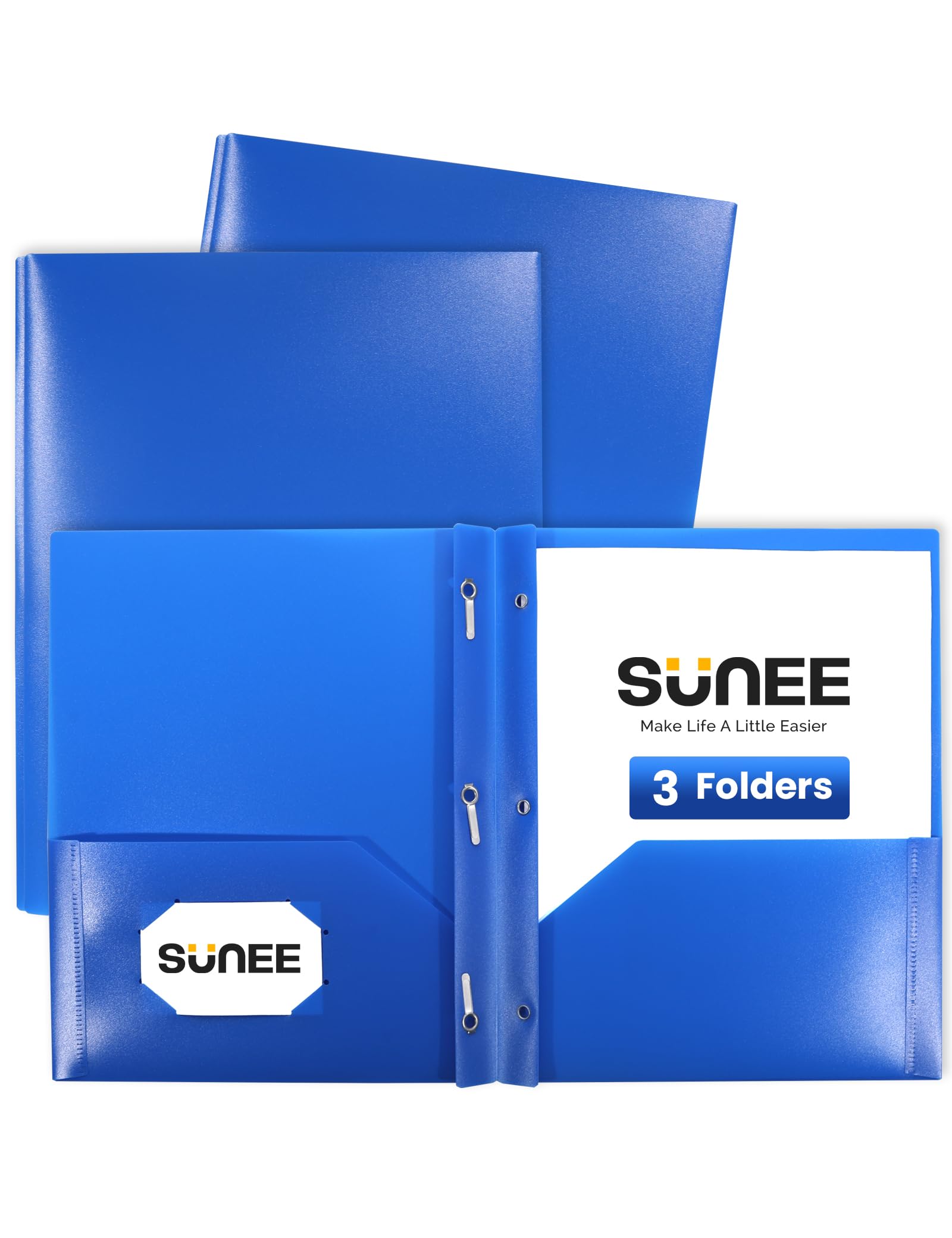 SUNEE 3 Pack Blue Plastic Folders with Pockets and Prongs, Letter Size, 9 x 11.5 in
