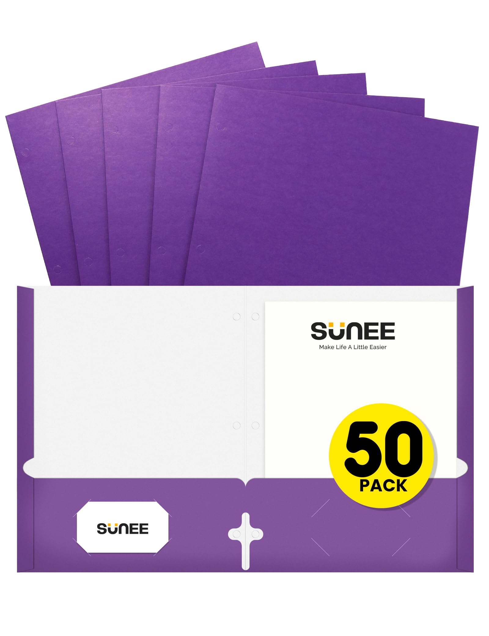SUNEE 3-hole punched folders come in a pack of 50, designed with two spacious pockets to securely hold letter-sized documents. The durable purple folders are ideal for organizing papers for school, office, or home use, offering a reliable and professional solution for filing and protecting important documents. Their compatibility with standard binders ensures easy storage and transport, enhancing your document management efficiency.