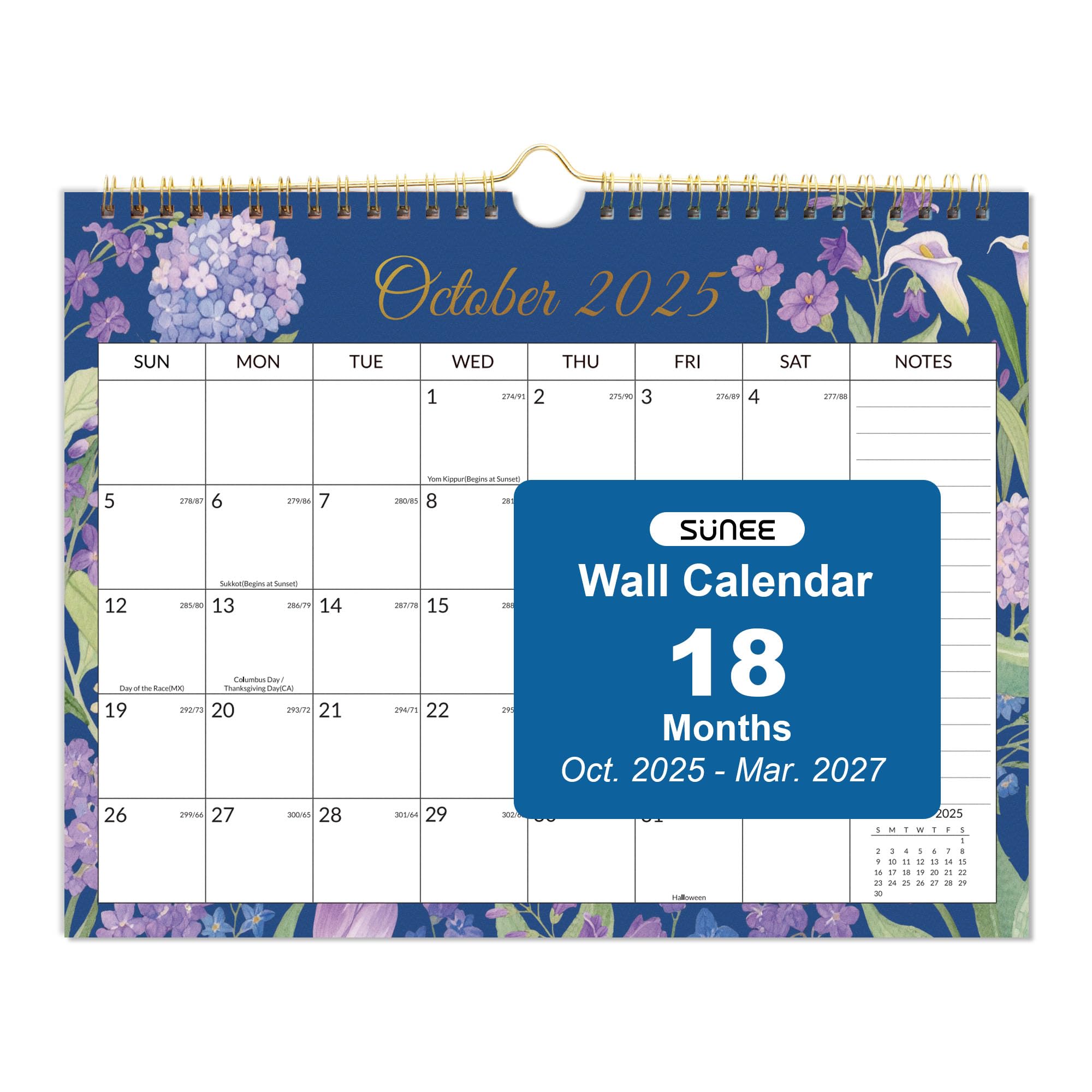 The SUNEE Wall Calendar 2025-2026 offers an 18-month span from October 2025 to March 2027, allowing extended planning and organization. Measuring 11" x 8.5", it features monthly grids with space for notes and a preview of the next month for seamless scheduling. Its elegant floral design adds aesthetic value while helping keep your appointments and tasks clearly visible and well-organized throughout the year. Ideal for professionals seeking a reliable and attractive calendar solution.