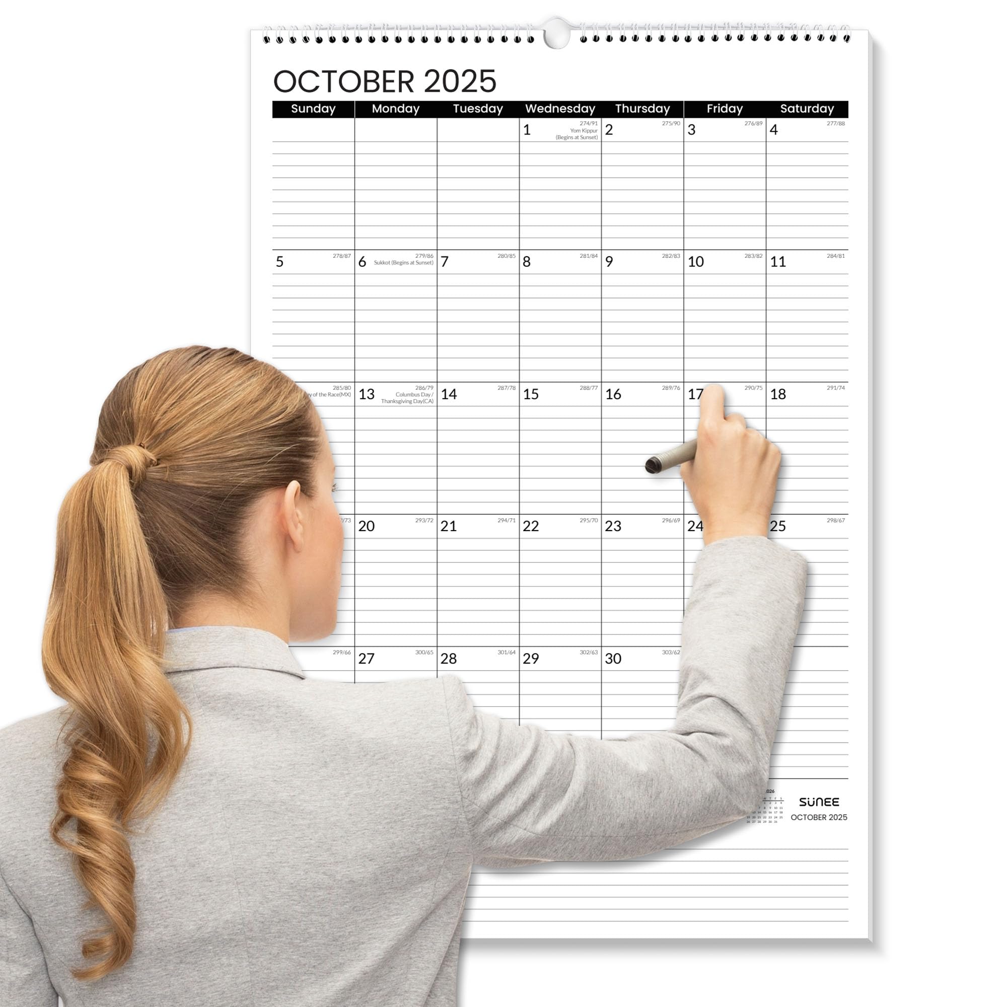 Stay organized with the SUNEE Wall Calendar 2025-2026. Measuring 22.75" x 15.5", this 21-month calendar spans from October 2025 through June 2027. Its vertical layout offers ample space for detailed notes and planning, making it ideal for both home and office use. The sleek black design combines clarity with professionalism, ensuring that your scheduling is both efficient and visually accessible. Perfect for those who require a reliable, extra-large monthly calendar to keep track of important dates and appointments well in advance.